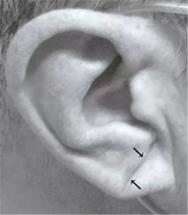 出现在耳垂部的一斜行凹沟,与水平线约成45度角。