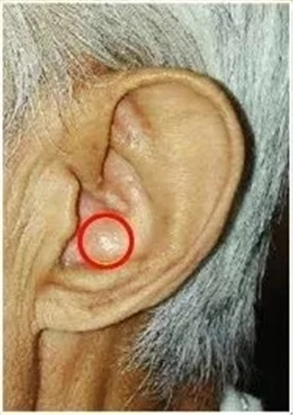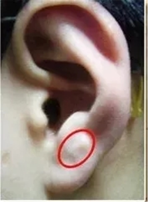 即在耳垂外上侧有一圆形(鼓包中央凹陷)或丘形突起。