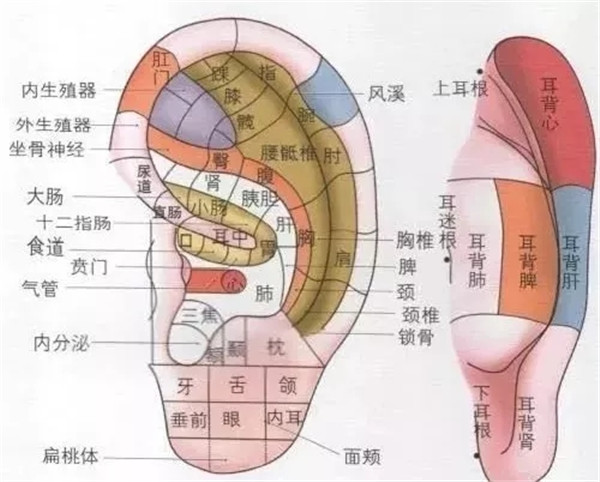 《厘正按摩要术》则分得更加仔细:“耳珠(耳垂)属肾,耳轮属脾,耳上(耳尖)属心,耳皮(皮肤和肉)属肺,耳背属肝。”