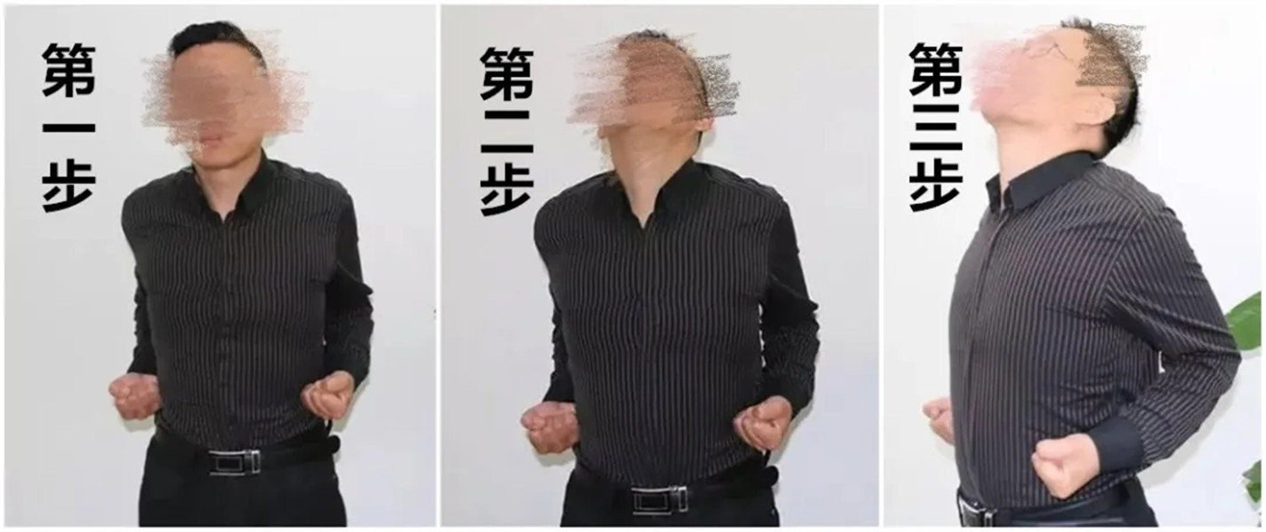 第二步:努力向后伸,双臂贴着两肋往后顶,顶到极限,两个肩胛骨往内收,用上肌肉的力量。然后头向后仰,仰到极限,停住,坚持5秒钟。