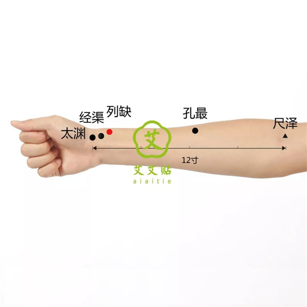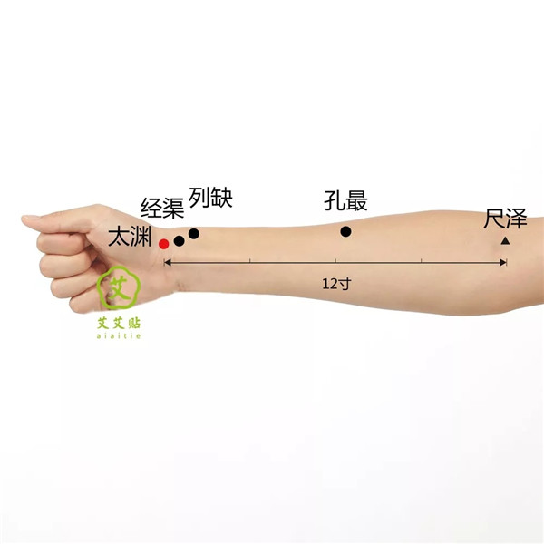 太渊往下是列缺穴,属于手太阴肺经之络穴,亦是八脉交会穴(通于任脉),与肺的功能密切相关,常与太渊穴合用。