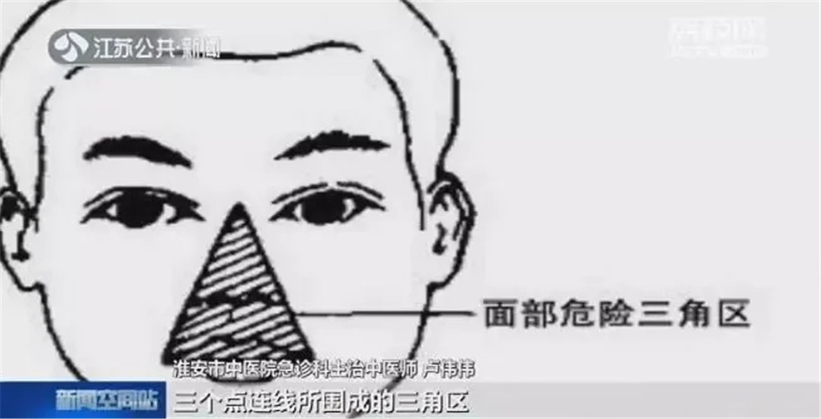 医生表示,面部“危险三角区”内的静脉血管中,缺少防止血液回流的“阀门”——静脉瓣。当向下回流的血管不通畅或局部受到挤压时,血液可以向上逆流至眼上静脉,经眶上而通向颅内蝶鞍两侧的海绵窦,将面部炎症传播到颅内,引起严重并发症,甚至危及性命。