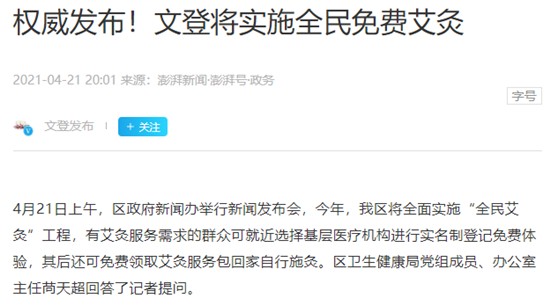 4月21日,山东省威海市文登区政府新闻办召开新闻发布会,宣布将在全区范围内实施“全民艾灸”工作,让每个有艾灸服务需求的群众都可以享受到免费艾灸体验服务。