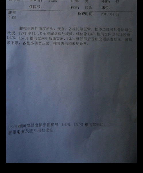 因为他这样腰痛的时间有点长,所以在4月17日中午还是去医院做个腰腿磁共震检查,一检查问题还真严重:腰椎管狭窄、腰间盘突出,医生说这种情况,建议做手术。