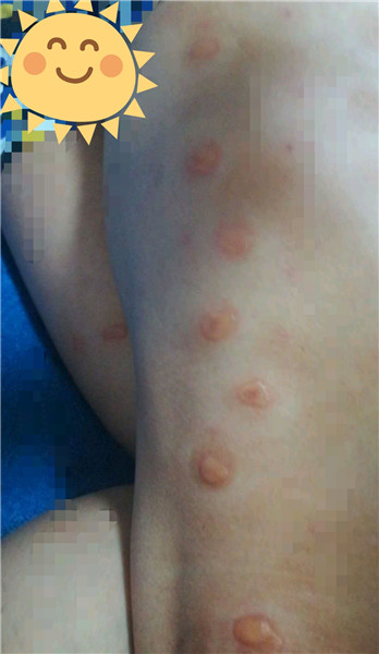 他在艾灸第六天时出现了排病反应--皮肤起水疱,如下图: