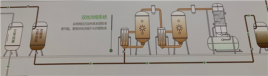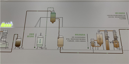 提取罐里面还有剩余的浓缩液会下沉到2楼,通过双效浓缩系统再次浓缩,将其中的水分蒸掉,得到浓度更高的浓缩液。