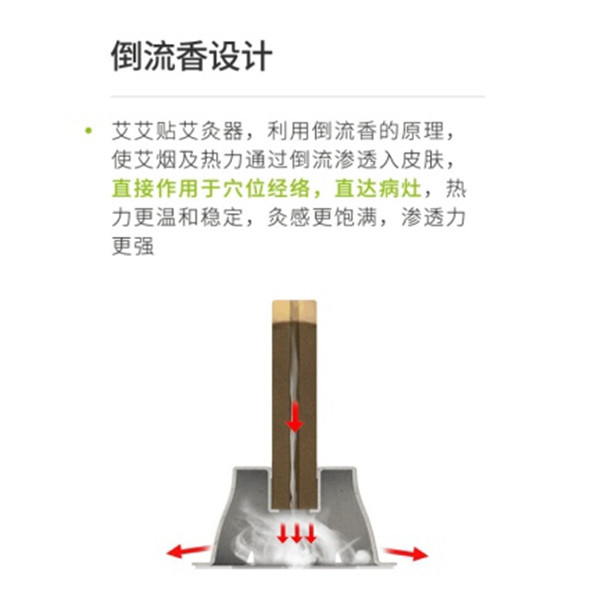 艾草本身已有渗透作用,艾艾贴还利用倒流香的设计原理,使艾的热力,艾烟以及艾精油通过倒流更加充分地渗透入皮肤,直接作用于经络穴位,直达病灶,渗透力更强,所以艾艾贴的效果非常好,是传统艾灸的3-5倍。