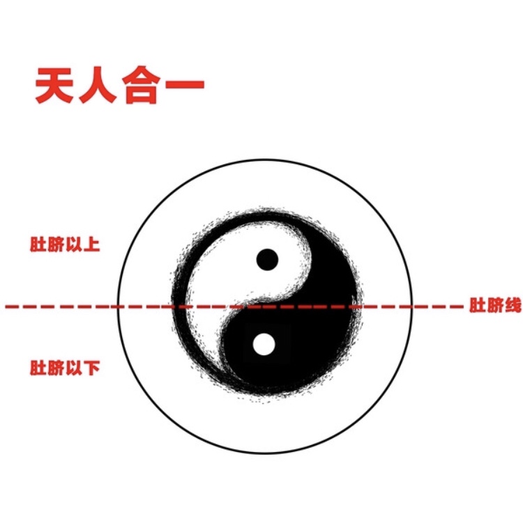 所以这个太极图也可以代表人体,中间这里有个虚线代表人体的肚脐线,虚线以上是肚脐以上,虚线以下是肚脐以下。