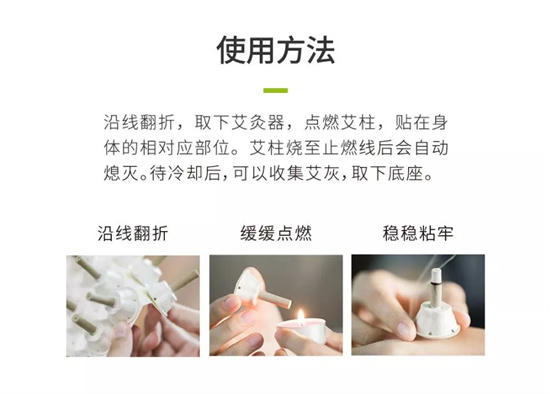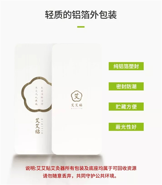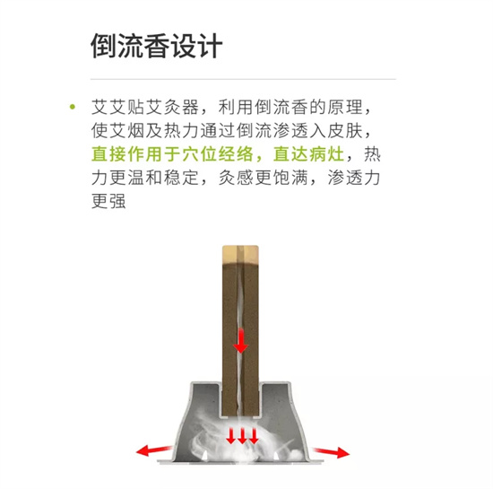 艾艾贴利用倒流香的设计原理,使艾的热力,艾烟以及艾精油通过倒流渗透入皮肤,直接作用于穴位经络,直达病灶,渗透力更强。