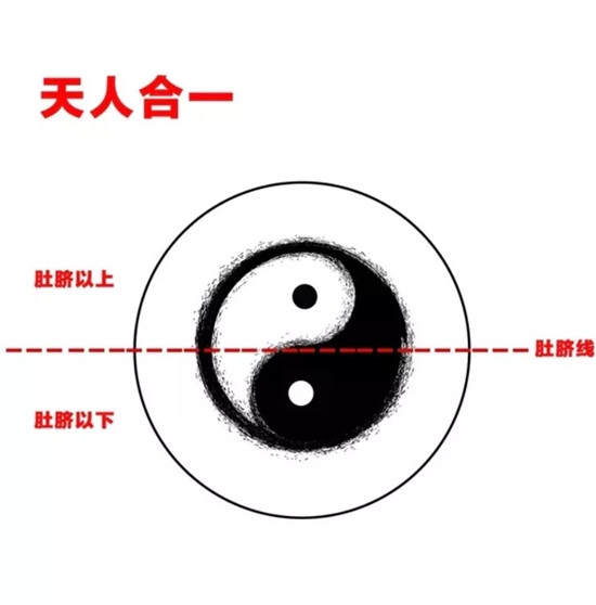 我们中医讲天人合一,我们人和大自然也是一个整体,大自然养育人类,让人类生生不息,不断发展,人类是如此依靠大自然,我们只有遵循自然规律,人类才能绵延无尽。所以这个太极图也可以代表人体,中间这里有个虚线代表人体的肚脐线,虚线以上是肚脐以上,虚线以下是肚脐以下。