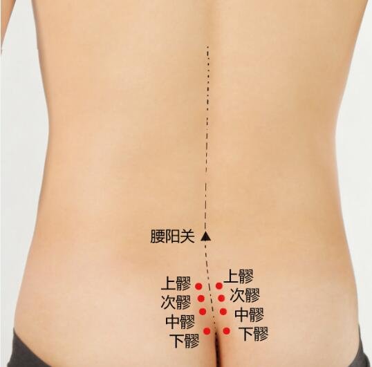 八髎:位置:骶椎。又称上髎、次髎、中髎和下髎,左右共八个穴位,分别在第一、二、三、四骶后孔中,合称“八穴”。