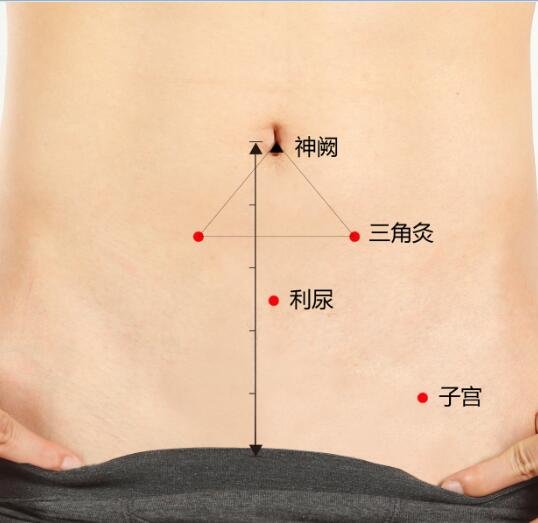 1、膈俞 2、肝俞 3、神阙 3、关元 4、三阴交 5、子宫 6、中极