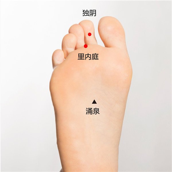 取穴时,可采用正坐或仰卧,跷足的姿势,里内庭穴位于脚底部,在第二趾根部,脚趾弯曲时趾尖碰到处。约第二趾趾根下约三厘米处。