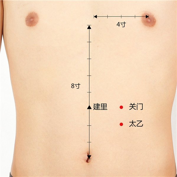 3、中脘:在上腹部前正中线上,脐上四寸。