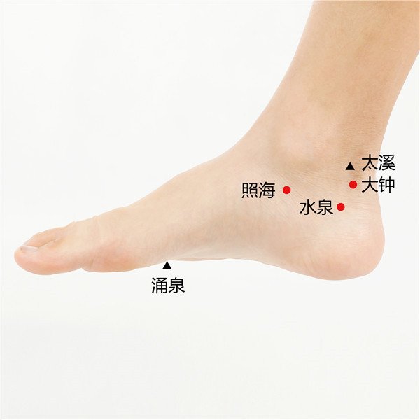天突,气舍,缺盆,华盖,膻中,期门,日月,章门,梁门,中脘,神厥,气海,关元,足三里,三阴交,太溪,涌泉,照海,膈俞,肝俞,脾俞,胃俞,肾俞,命门,痞根。