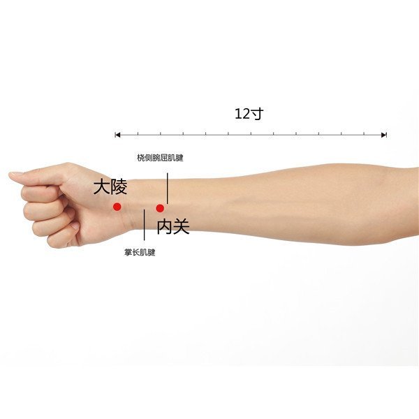 灸取穴位:内关,心俞,神门,涌泉,肾俞,三阴交,足三里。