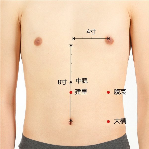 灸取穴位:胃俞穴、腰俞穴、中脘穴、天枢穴、足三里穴。