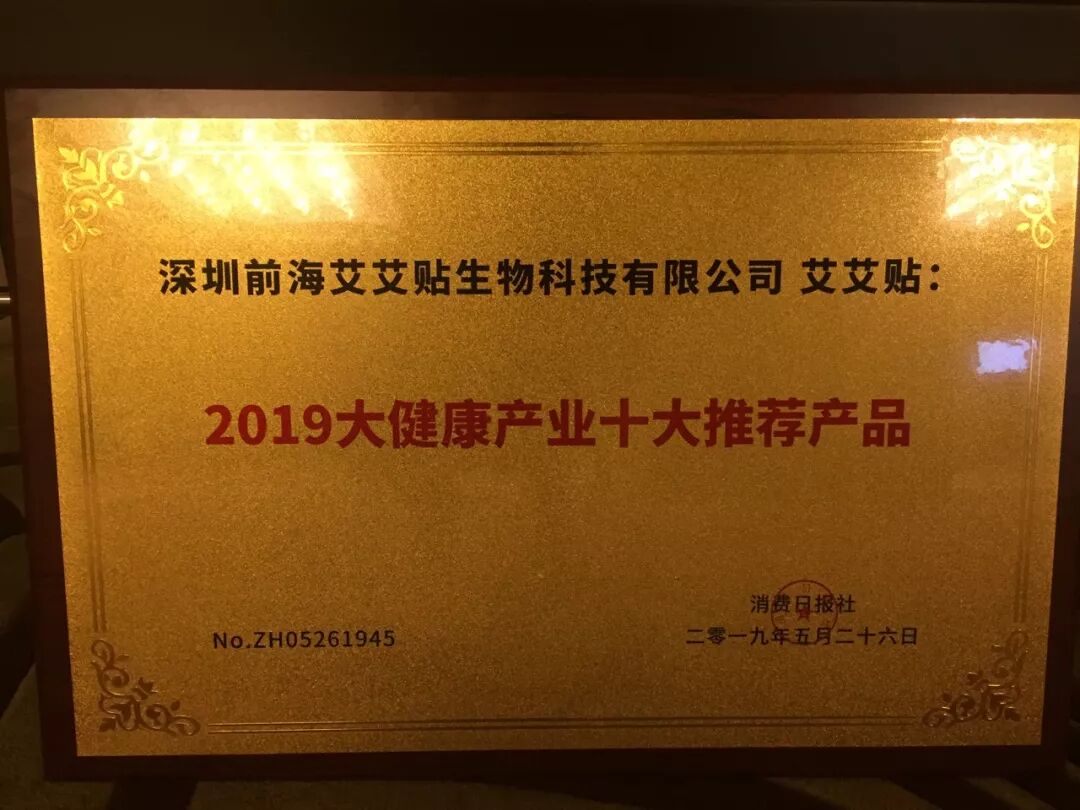 2019年5月26日,在“2019中国大健康产业诚信发展论坛暨大健康行业诚信自律倡议行动”上,艾艾贴艾灸器荣获了“2019大健康产业十大推荐产品”称号!