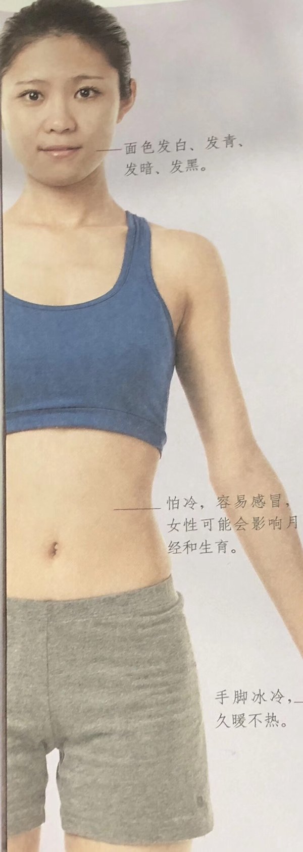 看脸色:面色发白、发青、发暗、发黑,颜色越暗,说明体内寒气越重,面色黯淡,没有血色。