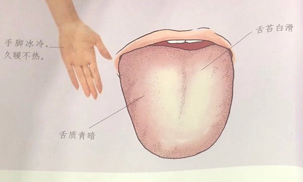 看舌头:舌体胖大,舌质淡或青暗,舌边有齿痕,舌苔白滑。