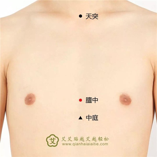在前正中线上,两乳头连线的中点。《灵枢·海论》说:“膻中者,为气之海”,意思是说膻中穴容纳了一身之气,艾灸此穴,便可打开“气闸”,保证周身之气的畅通。心情不好的时候,也可以按摩膻中穴,缓解低落的情绪。