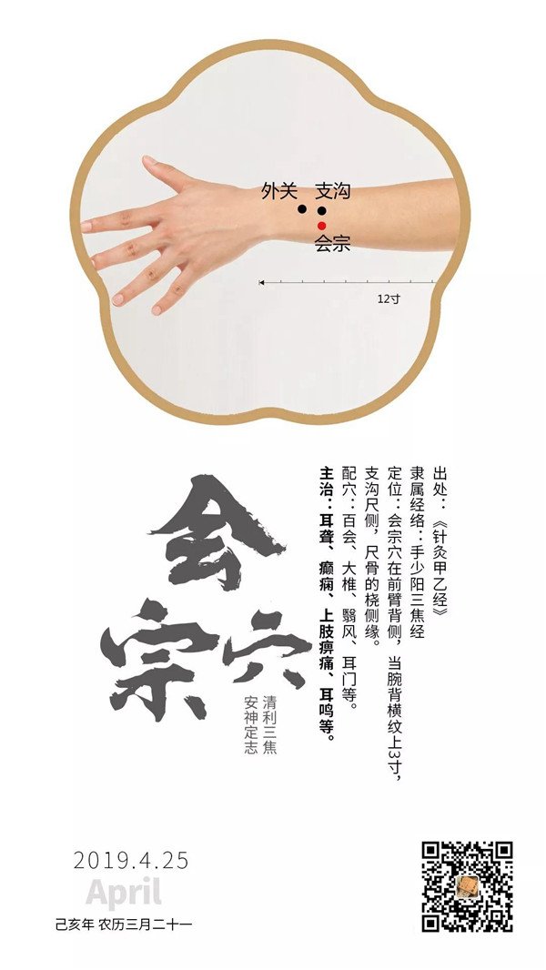 会宗配翳风、耳门、听会、中渚,治耳聋、耳鸣。
