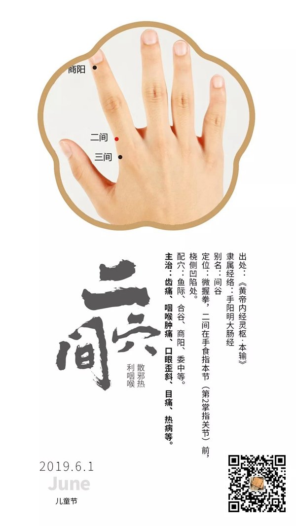 二间配鱼际、合谷,有清热泻火的作用,主治咽喉肿痛,牙痛。