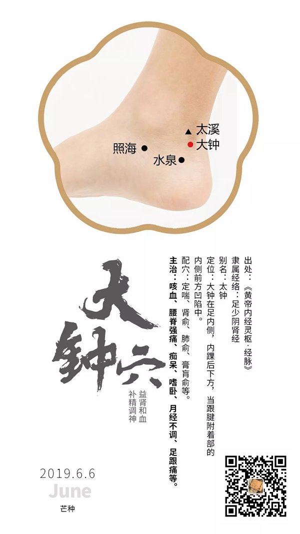 大钟配神门、太溪,有滋阴安神的作用,主治心悸,失眠。