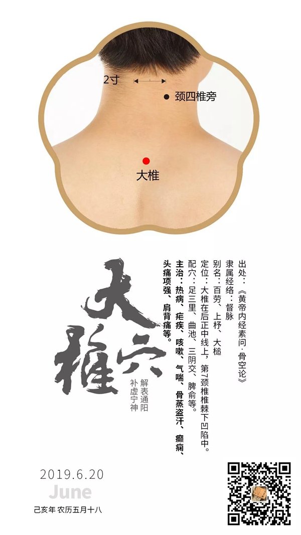 大椎配合谷、中冲,有解表泻热的作用,主治伤寒发热,头昏。