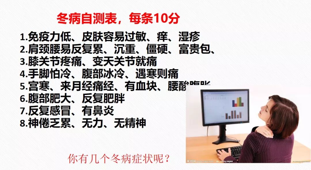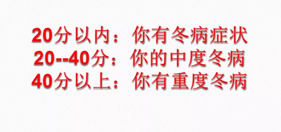 测一下,你有多少冬病呢?如果20分以内,那就说明你有冬病的症状,如果20-40分说明你的冬病是比较严重的。那40分以上,就说明你是典型的冬病的范畴了,那么当我们属于冬病的范畴就一定要把握好在夏天三伏天在这个时间利用大自然的馈赠,利用每年最热的这个阶段,把我们的毛孔全部打开,把我们身体底层的内层的寒湿全部排出来,这样的话,你的冬病在就会得到明显的改善,坚持艾灸一到三年,会更加的显著。