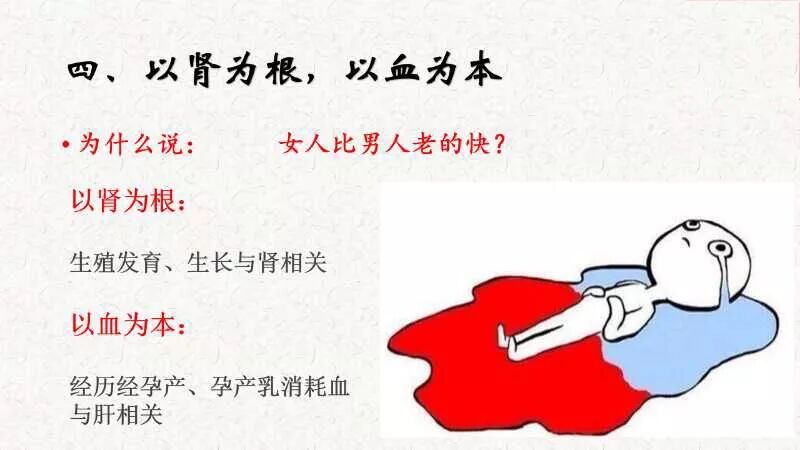 女人是以肾为根的,肾主女人的生殖,子宫,卵巢的。以血为本,有滋养的作用,滋养我们身体的五脏六腑的。