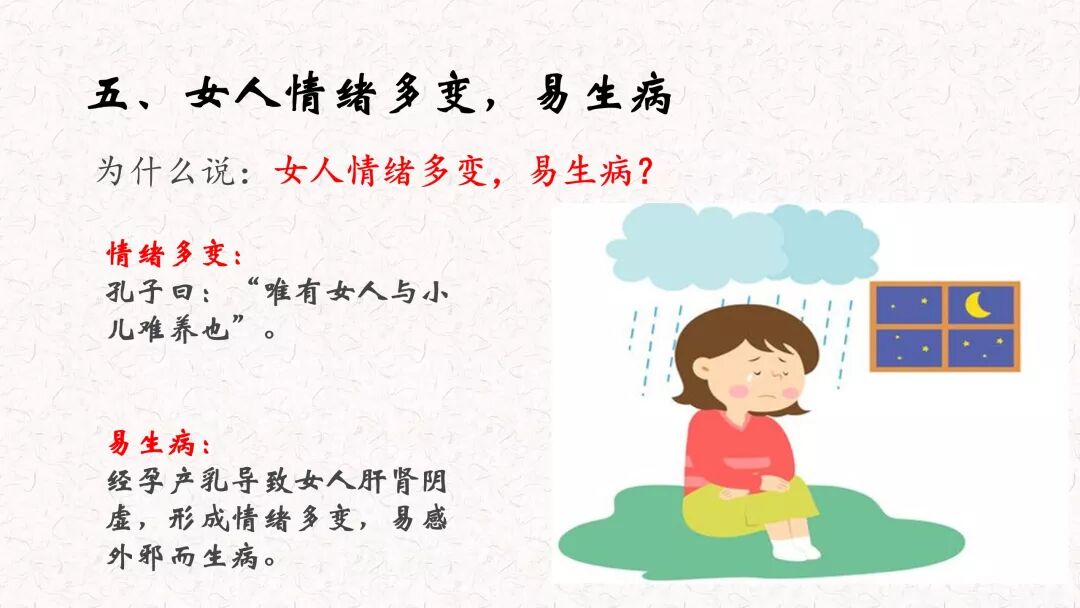 女性耗的气血是非常多的,女性到最后就容易出现一个肝肾阴虚而形成情绪多变,还容易外感邪气导致生病。其实是因为脾肾都虚了,导致肝血不足了,所以我们女性脾气就暴躁了。而女性一旦脾气暴躁,情绪不稳定,会经常被说成是更年期来了。