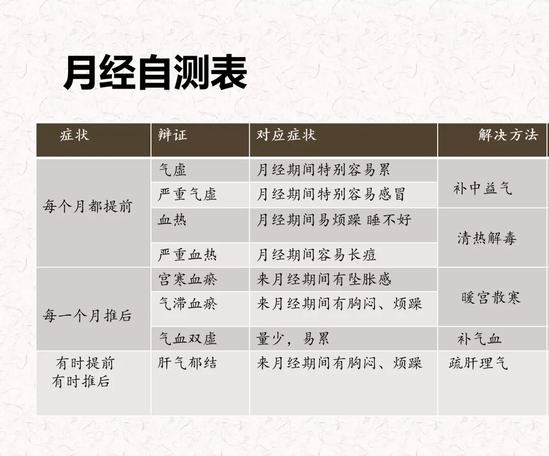 接下来,给大家一个月经的自测表,大家自我检测一下自己属于一个什么症状?