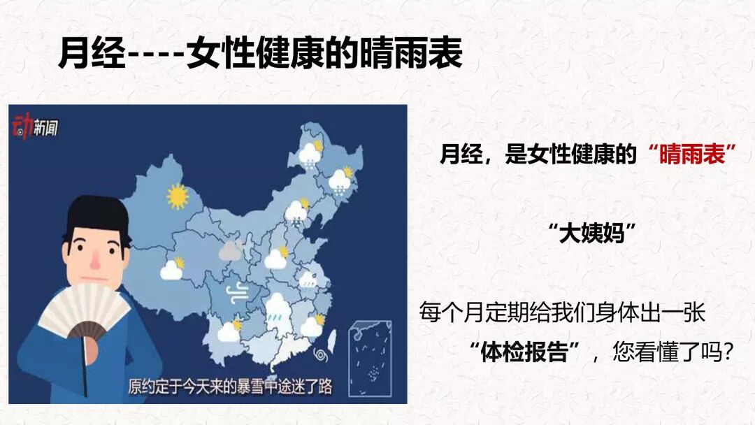 我们女性是一个压力比较大的一个群体,但是相对于来讲,我们女人跟男人对比是幸福的,我们女人每个月有月经。那月经其实是我们女性健康的晴雨表,是我们身体每个月给我们出的一张体检报告。