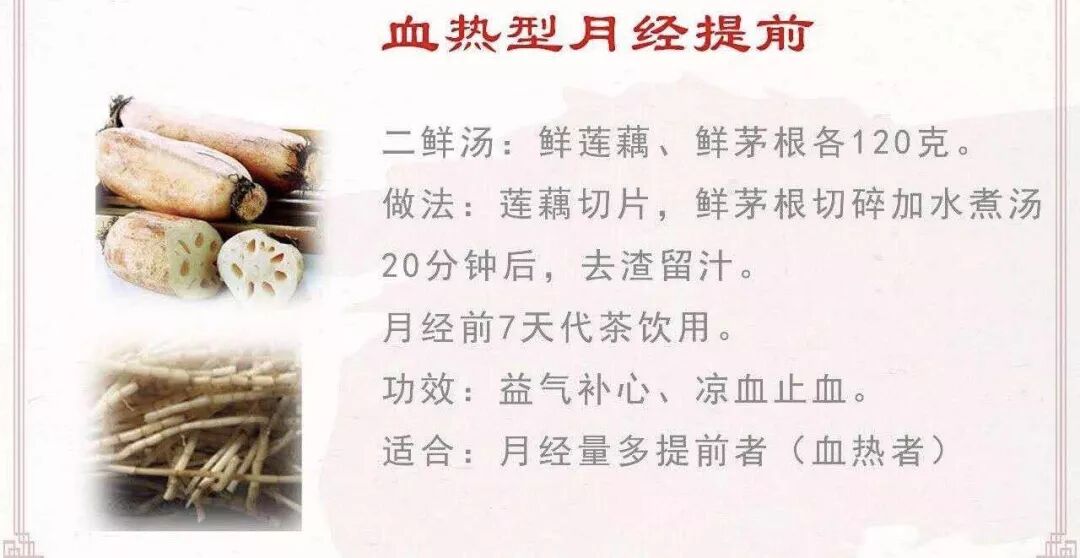 还有一个就是血热引起的,当我们的血热的情况下就会产生强大的推动力,推动力强了以后就是中医说的破血妄行,意思就是动力足了,它速度就快了,所以推动月经也会提前拿,那这个时候来的月经颜色就会被偏红一点的,因为血热,有热量,所以颜色会偏红一点。