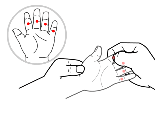 手法:妈妈用拇指指尖,从宝宝的食指开始轻轻掐揉四横纹,掐1下、揉3下,逐个手指操作,共做3~5遍。