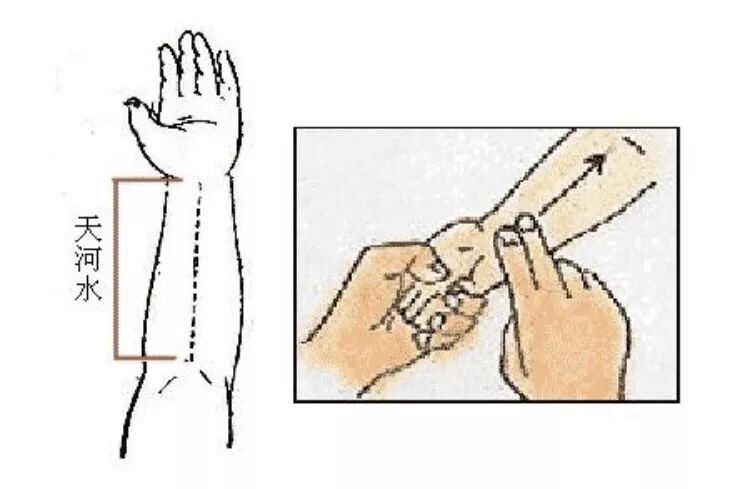 穴位:天河水,这是推拿的穴位名,和艾灸的穴位不同。