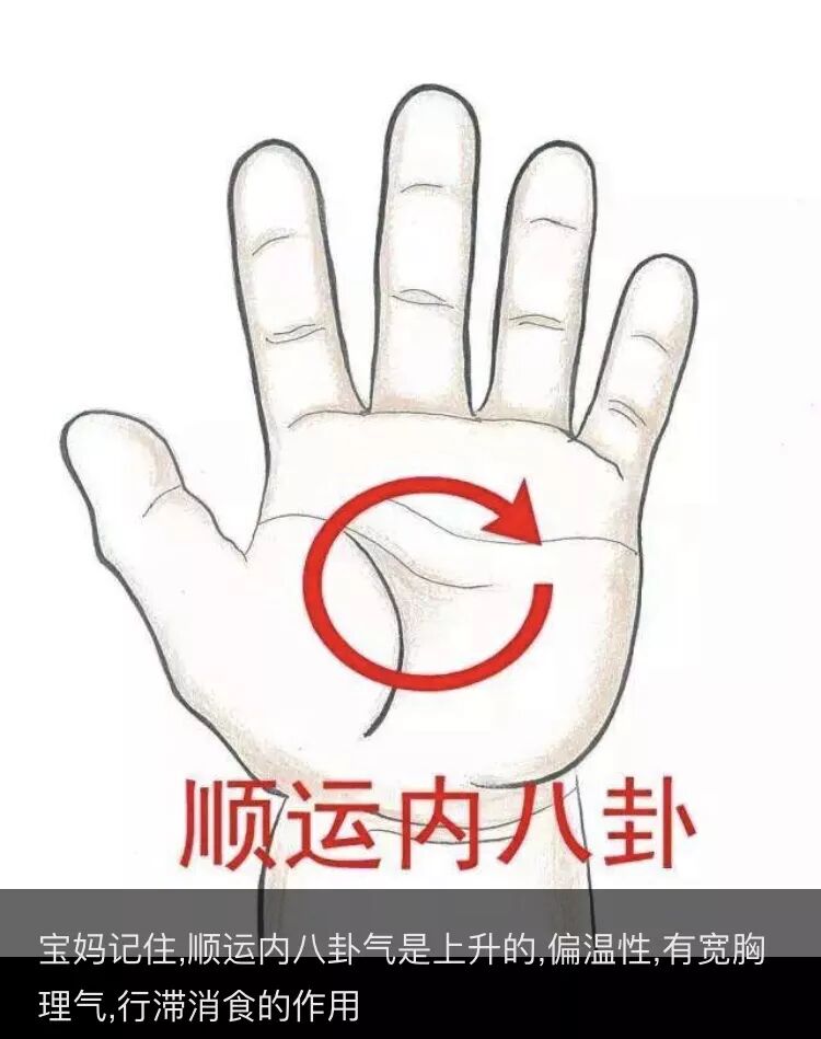 操作方法:用运法,妈妈以右手食、中二指夹住患儿拇指,然后妈妈用拇指或中指腹作顺时针方向运转,称运内八卦法。