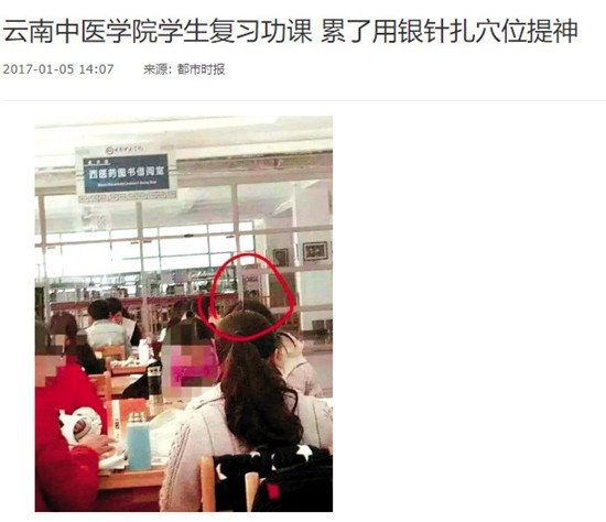 之前有一则新闻,报道了云南中医学院针灸推拿专业的一名学生,期末考试为给自己复习提神,用银针扎自己头上的百会、四神聪的事例。
