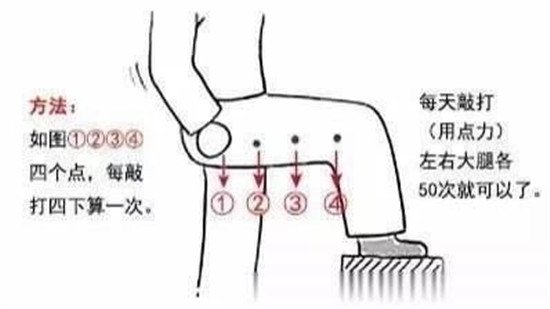 由于大腿肌肉和脂肪都很厚,因而必须稍微用力,以每秒大约两下的节奏敲,才能有效刺激穴位。