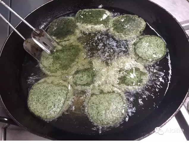 将做好的小圆饼放入热好的油里煎一会儿,这时要小心艾草粑粑粘锅。