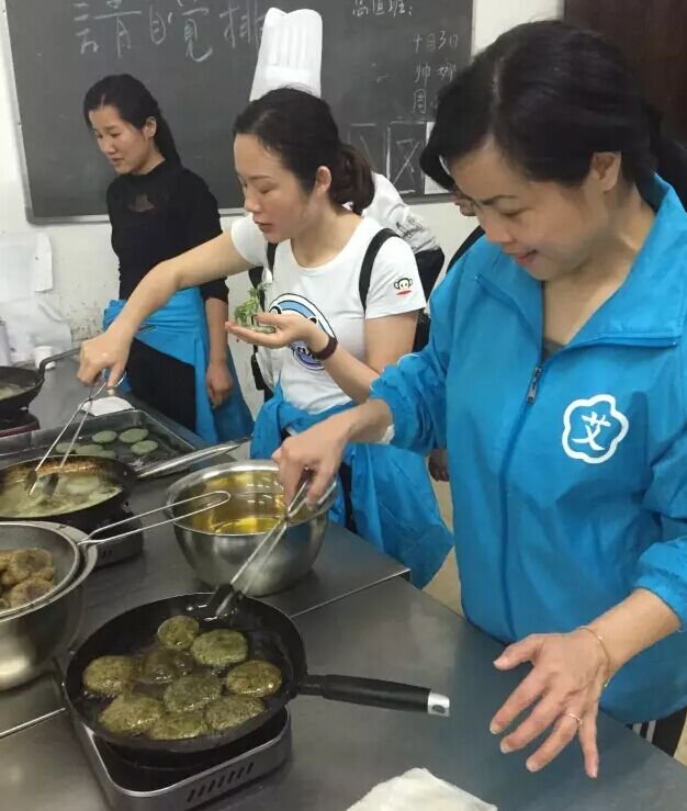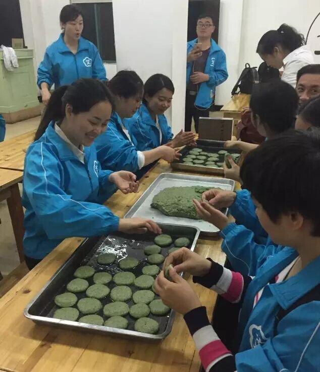 一众人共同制作艾草粑粑,手上抹上一点儿油,然后将和好的面团做成小圆饼就可以了。不过怎么做出来的大小不一呢!
