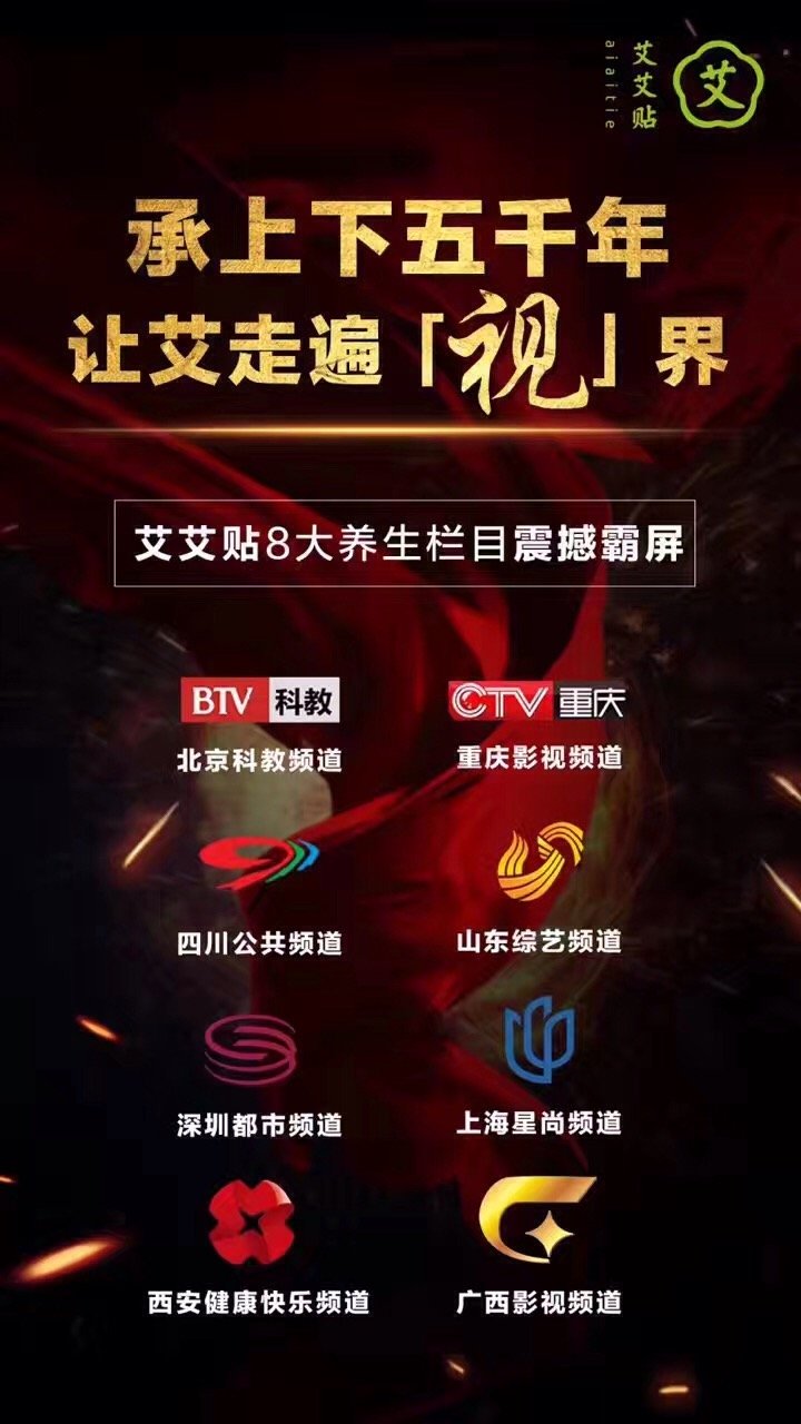 7月11日起,艾艾贴将携手北京科教频道、上海星尚频道、深圳都市频道、四川公共频道、重庆影视频道、山东综艺频道、西安健康快乐频道等频道的养生栏目,共同传承中医养生,传播艾灸文化。